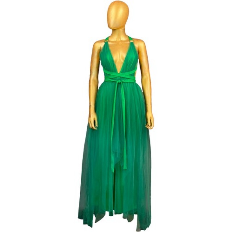 Легкое и нежное фатиновое платье природного зеленого цвета с декоративными переплетениями.
