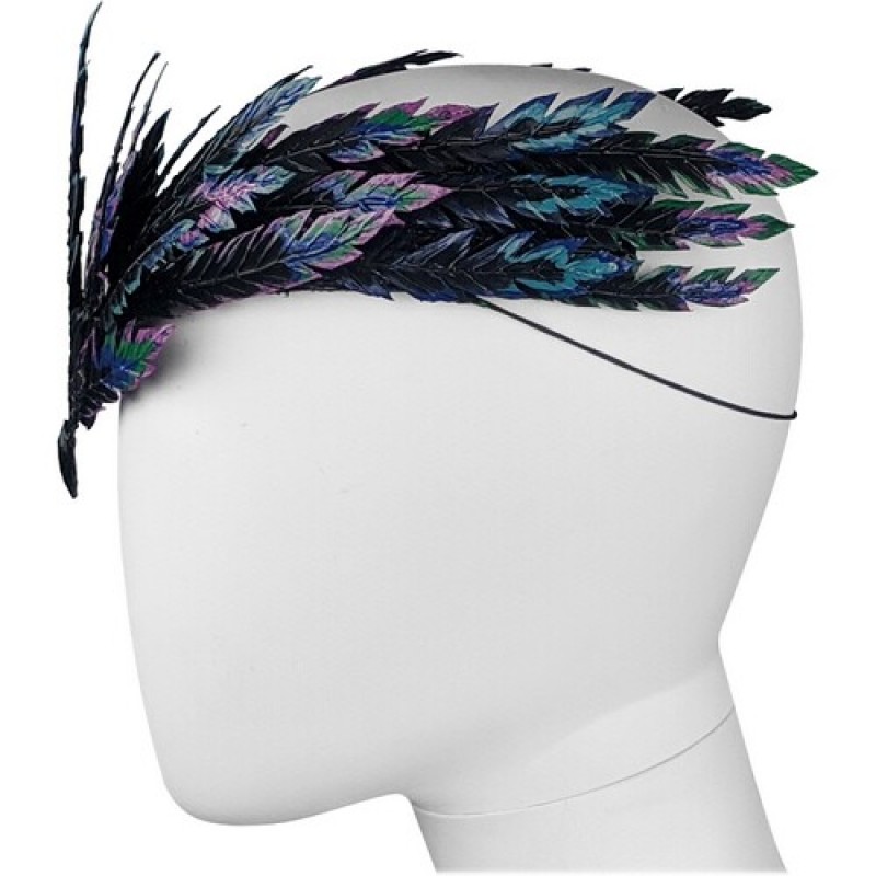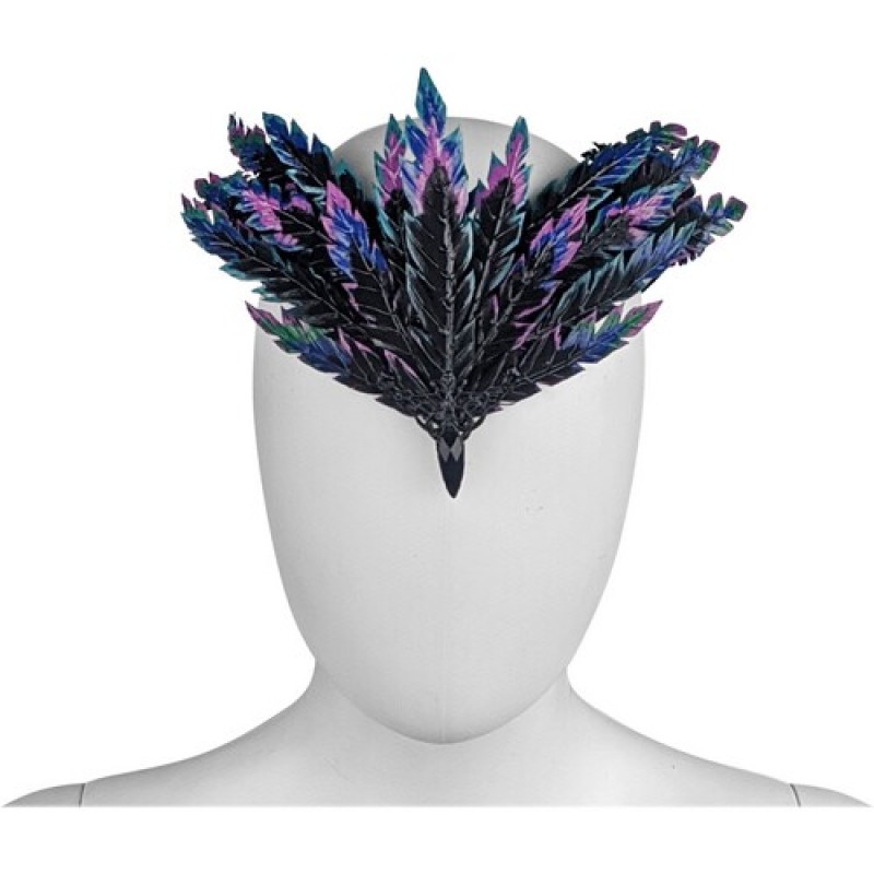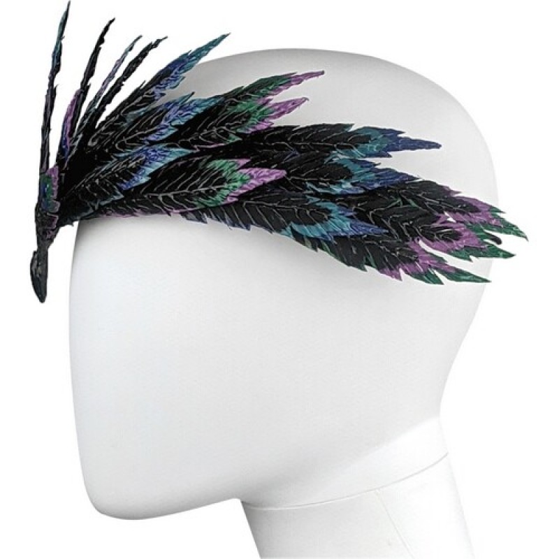 Еффектный головной убор, декорированный чёрными с золотистой окраской перьями, вензелем и стразом - отличный выбор для готической вечеринки, фотосессии, для дополнения карнавальных образов: птица феникс, лебедь, жар-птица, сорока, ворона. Размер универсальный, фиксируется с помощью двух металлических заколок.