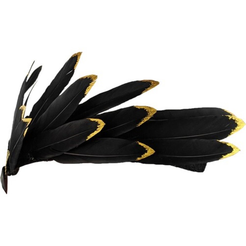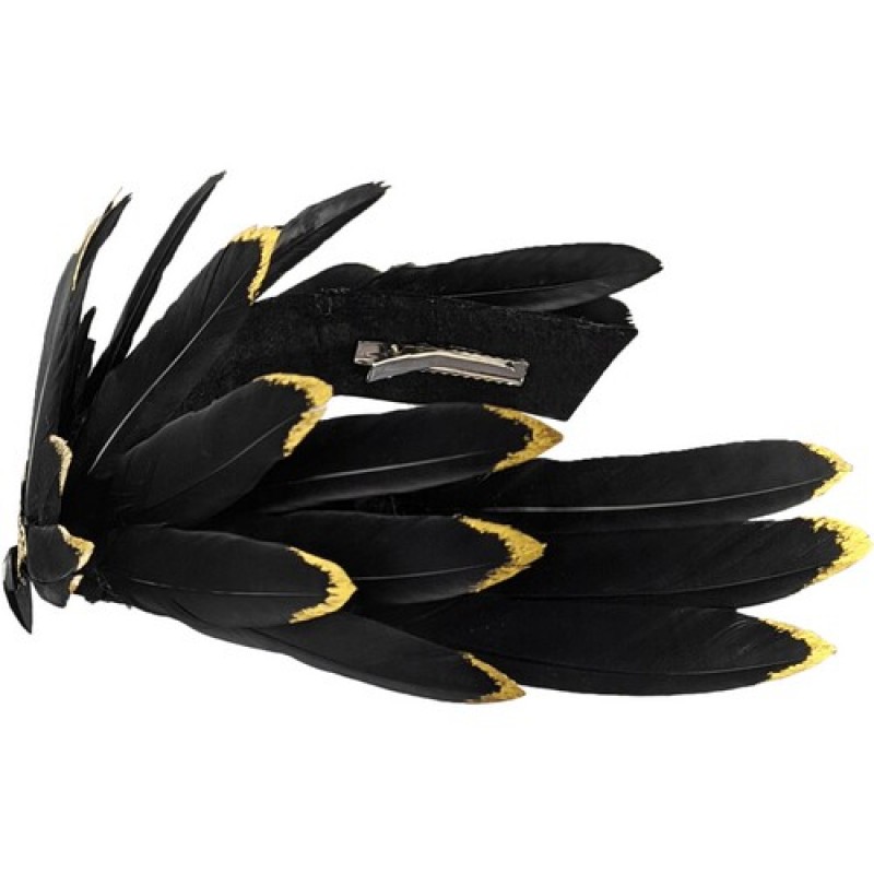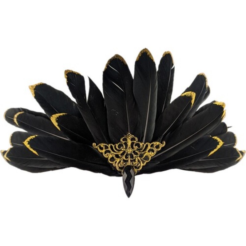 Эффектный головной убор, декорированный чёрными с золотистой окраской перьями, вензелем и стразом - отличный выбор для готической вечеринки, фотосессии, для дополнения карнавальных образов: птица феникс, лебедь, жар-птица, сорока, ворона. Размер универсальный, фиксируется с помощью двух металлических заколок.