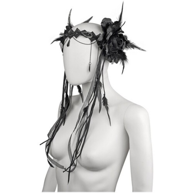 Оригинальный головной убор, декорированный крупными чёрными розами, перьями, кружевом, металлической цепочкой и чёрными стразами - отличный выбор для готической вечеринки, фотосессии, для дополнения карнавальных образов: тёмный эльф, злая колдунья, нимфа. Размер универсальный, фиксируется с помощью резинки.