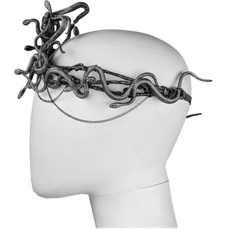 Невероятно красивый головной убор, декорированный причудливо извивающимися змеями, тонкими цепочками и изображением медузы Горгоны. Этот великолепный головной убор - прекрасное дополнение к карнавальному образу богини Горгоны, а также прекрасный выбор для фотосессии, тематической вечеринки, поможет создасть величественный, роскошый и незабываемый образ на Хэллоуин. Размер универсальный, резулируется за счёт резинки.