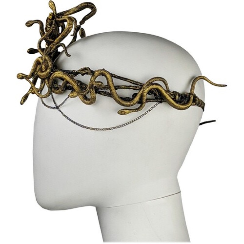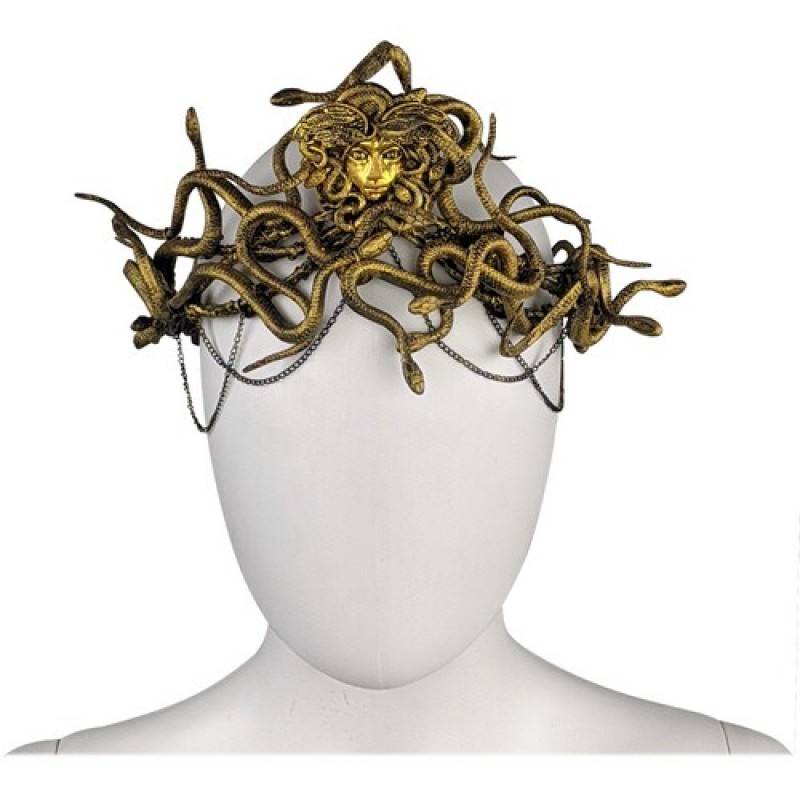 Невероятно красивый головной убор, декорированный причудливо извивающимися змеями, тонкими цепочками и изображением медузы Горгоны. Этот великолепный головной убор - прекрасное дополнение к карнавальному образу богини Горгоны, а также прекрасный выбор для фотосессии, тематической вечеринки, поможет создасть величественный, роскошый и незабываемый образ на Хэллоуин. Размер универсальный, резулируется за счёт резинки.