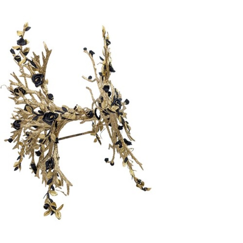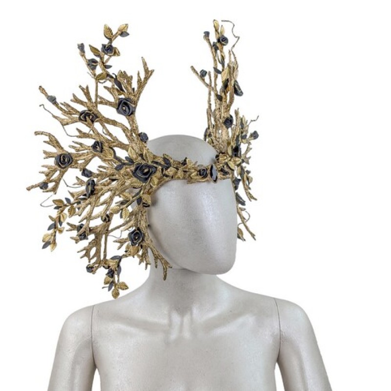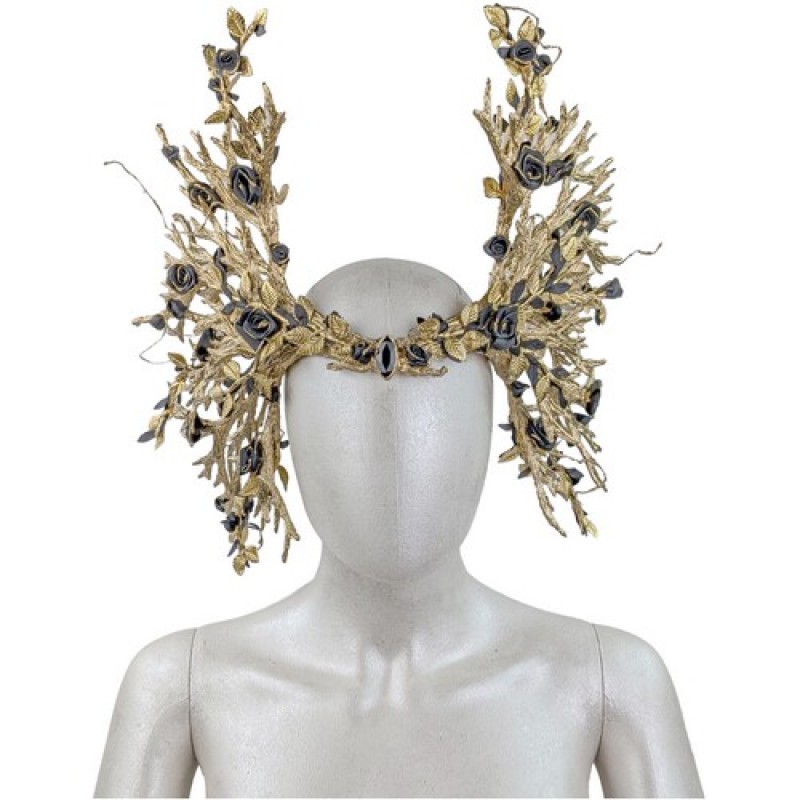 Головной убор с ветвями золотистого цвета декорированы черными розочками, дополняющий образ Нимфы, Лесной Феи и Эльфийки.