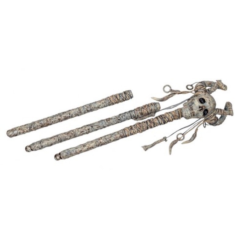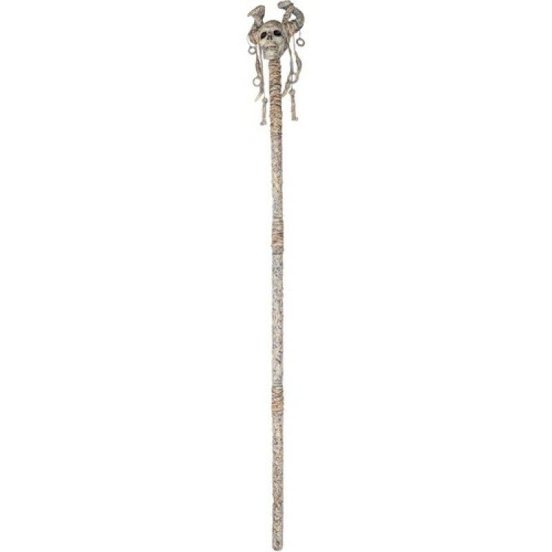 Отличный аксессуар в форме посоха, декорированный черепом с рогами и подвесками из клыков и металических деталей, идеальное дополнение шаманского или варваского образа.