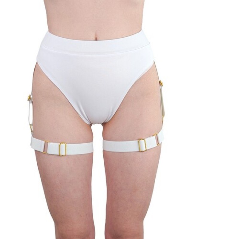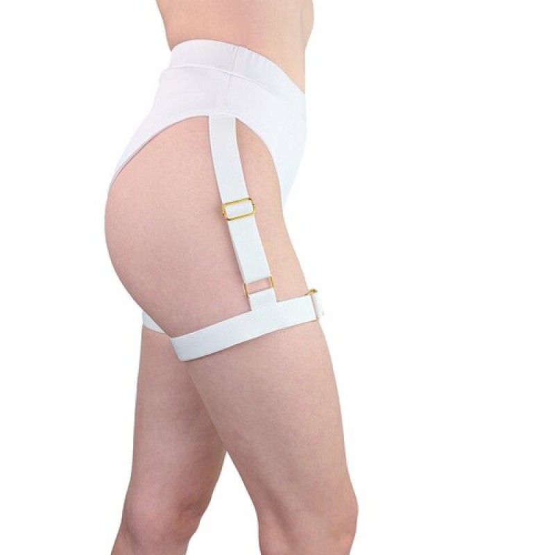 Высокие белые трусики с эластическими регулируемыми ремешками и металическими деталями.