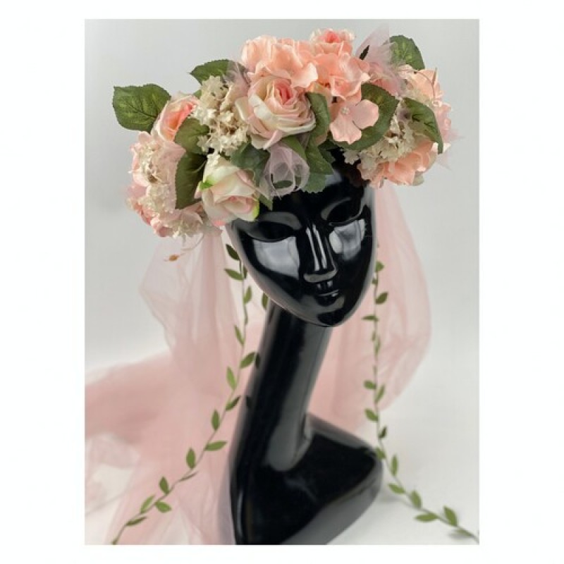 Венок из нежных крупных роз , украшенный зелеными листочками, соцветиями, кусочками фатина и фатой. Завязывается с помощью лент. Красивый и нежный венок - идеальный аксессуар для любой богемной свадьбы, девичника или фестиваля. Отлично подходит для отдыха, праздников, вечеринок, дней рождения, фотосессий. Подходит для костюмов: цветочный эльф, нимфа, фея.