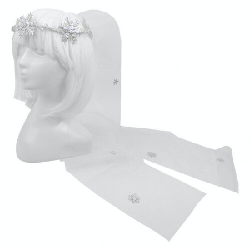 Оригинальный новогодний венок, декорированный снежинками shine и прозрачными бусинами разного диаметра. Регулируется с помощью длинных блестящих лент из фатина, украшенных серебристыми снежинками, с помощью которых создаётся длинная фата.