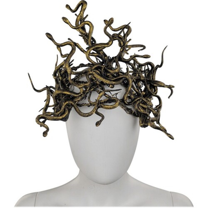Невероятно красивый головной убор, декорированный золотисто-чёрными пластиковыми ветками извивающимися змеями. Этот великолепный венок-корона - прекрасное дополнение к карнавальному образу богини, одной из сестер Горгон, а также прекрасный выбор для фотосессии, тематической вечеринки, поможет создасть величественный, роскошый и незабываемый образ на Хэллоуин. Дополнительно фиксируется с помощью резинки.