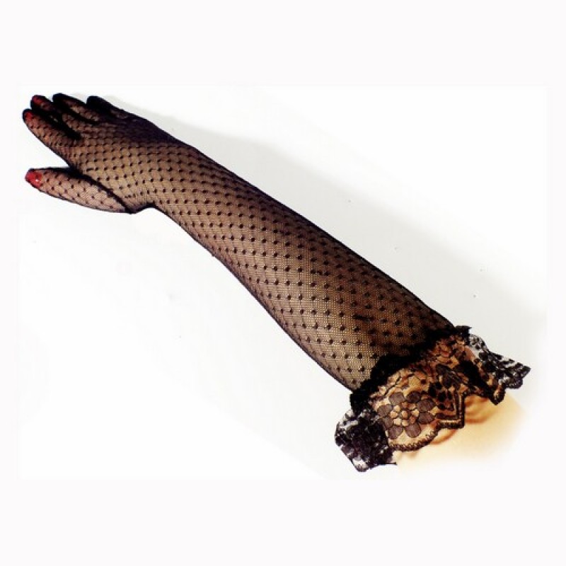 Довжина 46 см. Стрейчові довгі рукавички (сіточка в горошок). Підходять на будь-яку повноту руки, в основному рюші прикривають лікоть.