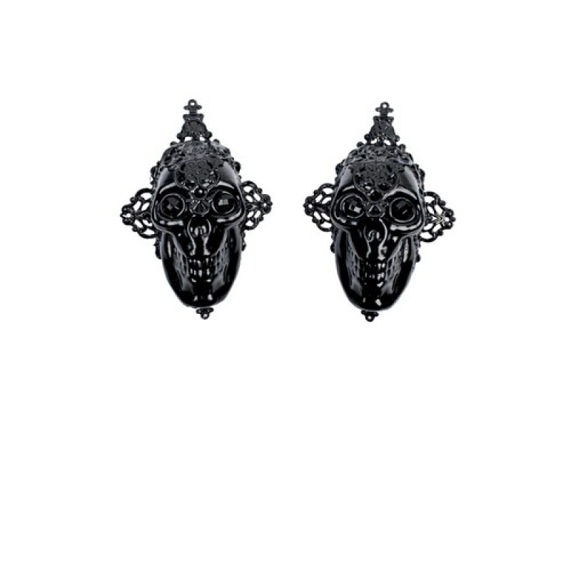 Готичні сережки у вигляді об'ємних черепів, оздоблені камінчиками та вензелями.