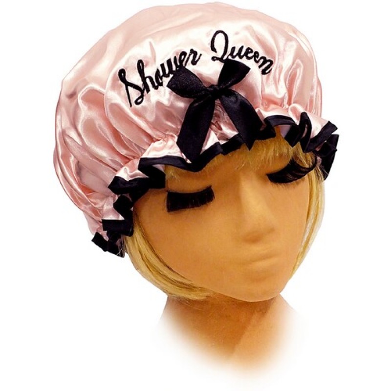 Розмір - 56. Гламурна шапочка для душа на резинці, з бантиком і написом-вишивкою: Shawer Queen. Верх шапочки - атласна тканина, внутрішня частина - непромокаюча клейонка.