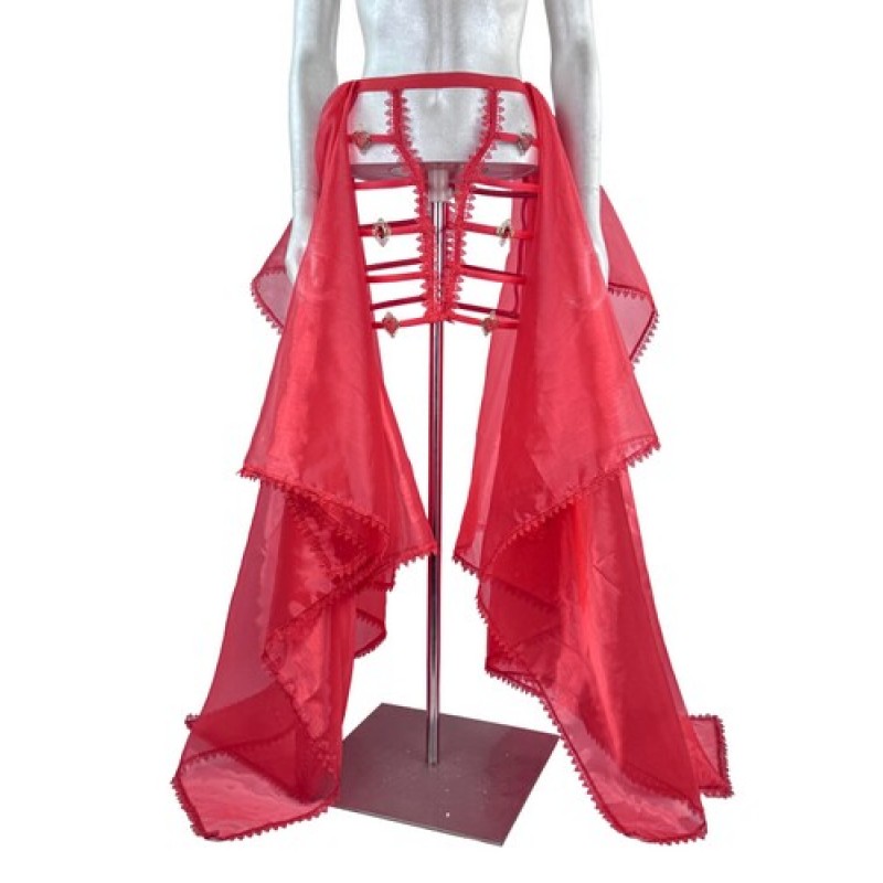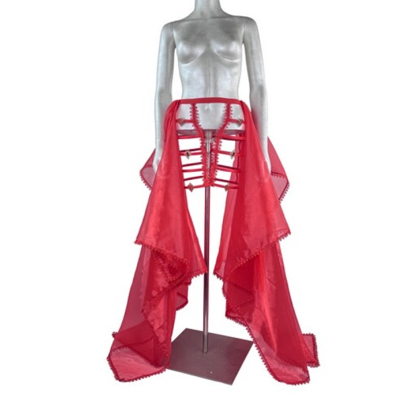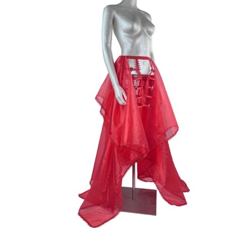 Ефектна спідниця у яскравому червоному кольорі, поєднує прозору легку тканину та каркасний під'юбник з декоративними елементами у формі сердець.