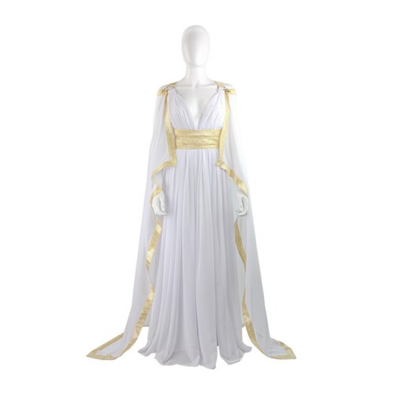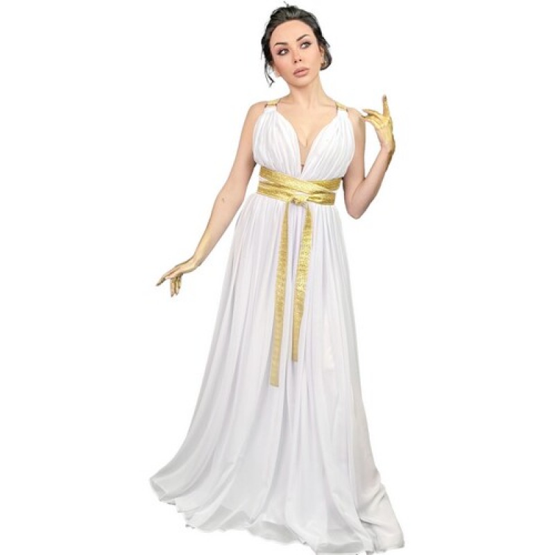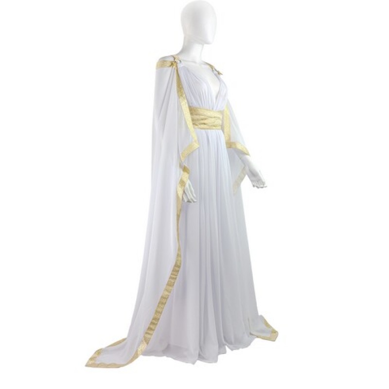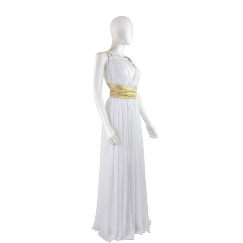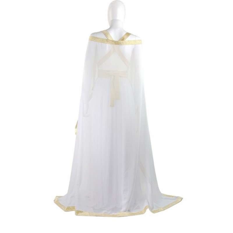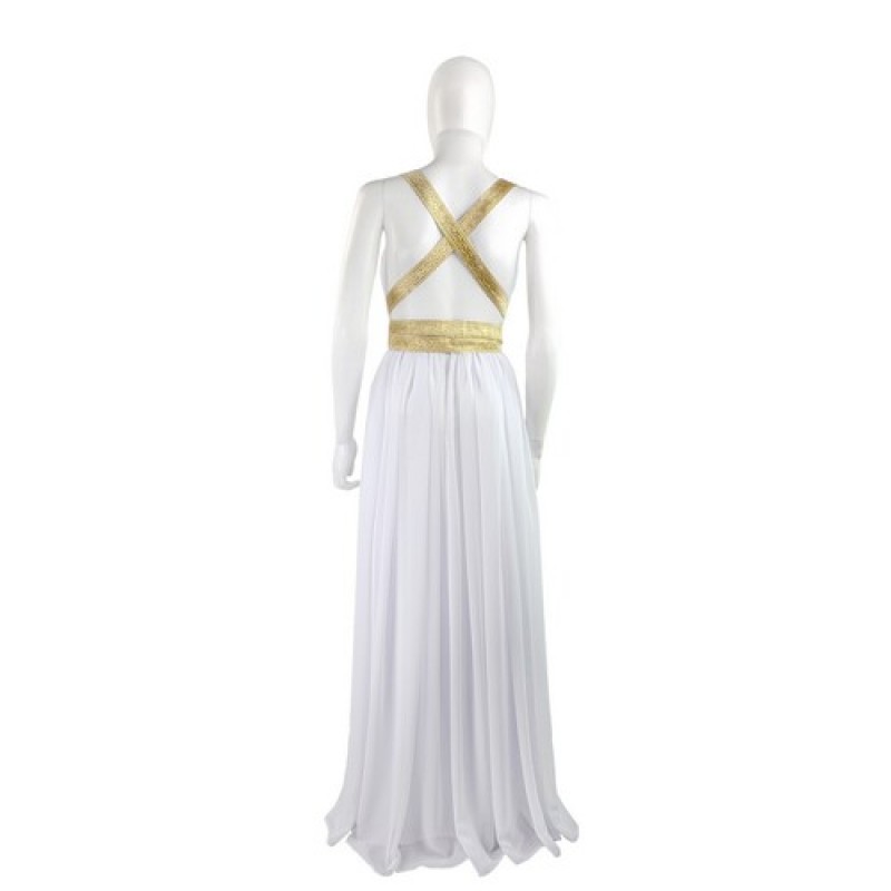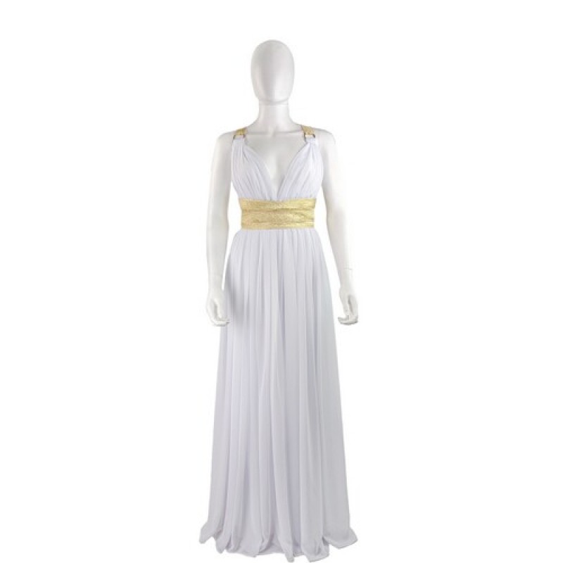 Легка та елегантна біла сукня зі з'ємною накидкою в грецькому стилі, декорована золотистою кайомкою і металевими елементами.