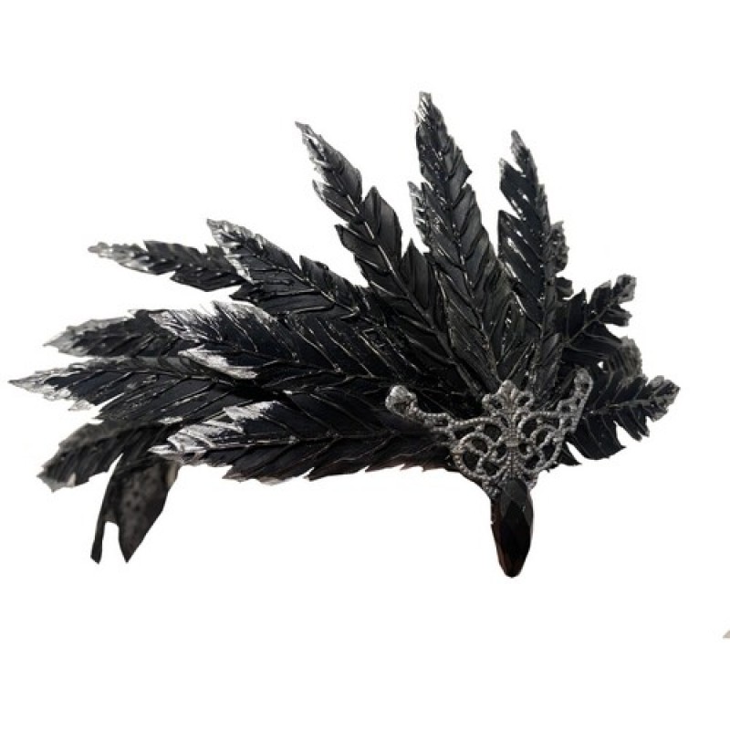 Ефектний головний убір, декорований чорним з сріблястим пір'ям, вензелем та стразом - відмінний вибір для вечірки, фотосесії, для доповнення карнавальних образів: птах фенікс, лебідь, жар-птиця.