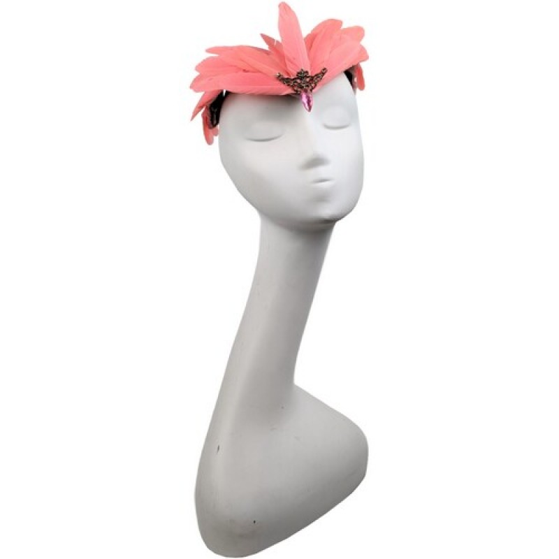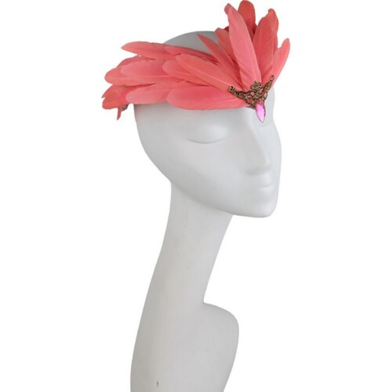 Ефектний головний убір, декорований пір'ям, вензелем та стразом - відмінний вибір для вечірки, фотосесії, для доповнення карнавальних образів: фламінго, птах фенікс, лебідь, жар-птиця.