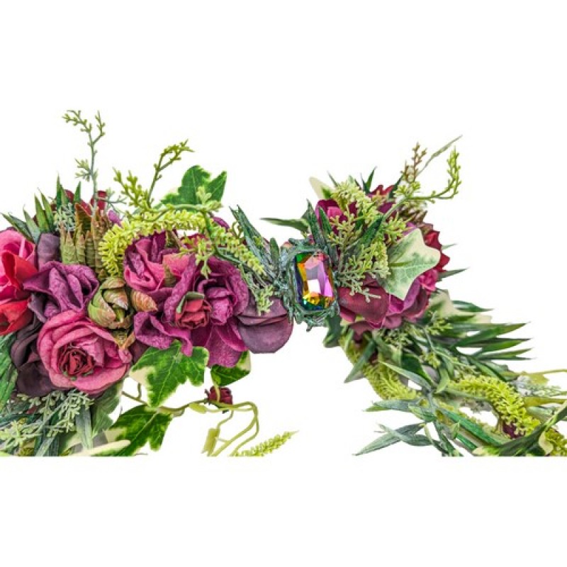 Неймовірно чарівна тіара декорована пишними штучними квітами, зеленню та довгими гілочками що спадають по боках.