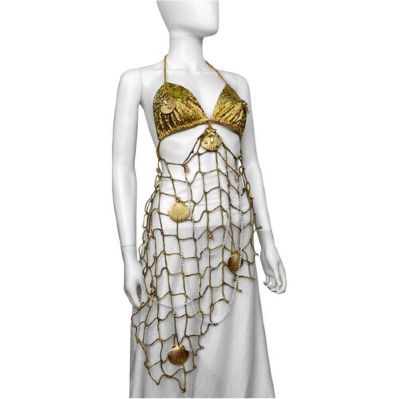 Золотистий топ, декорований сіткою, великими і маленькими мушлями прикрашеними камінням хамелеон і перлинами.