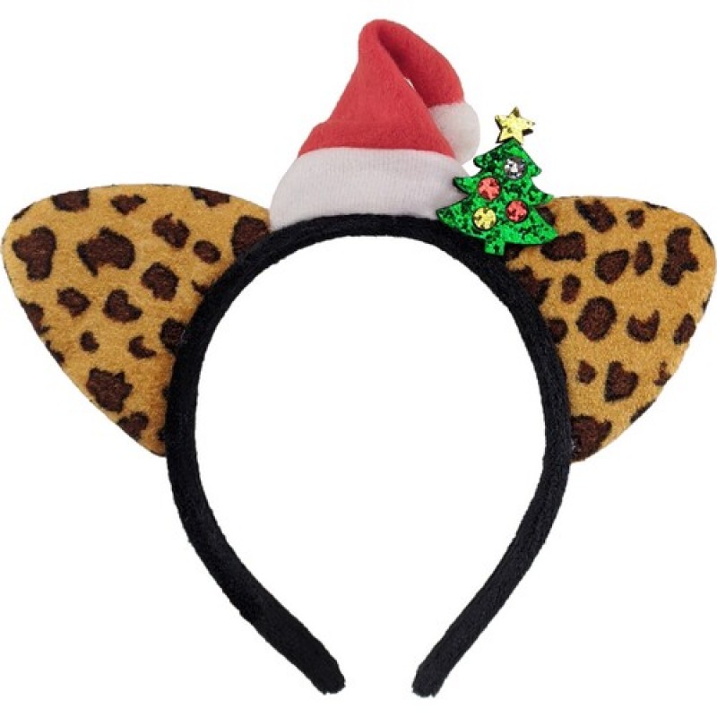 Плюшеві вушка леопардового кольору на пластиковому обручі, обтягнутому чорною тканиною. Елегантна деталь новорічного карнавального вбрання.