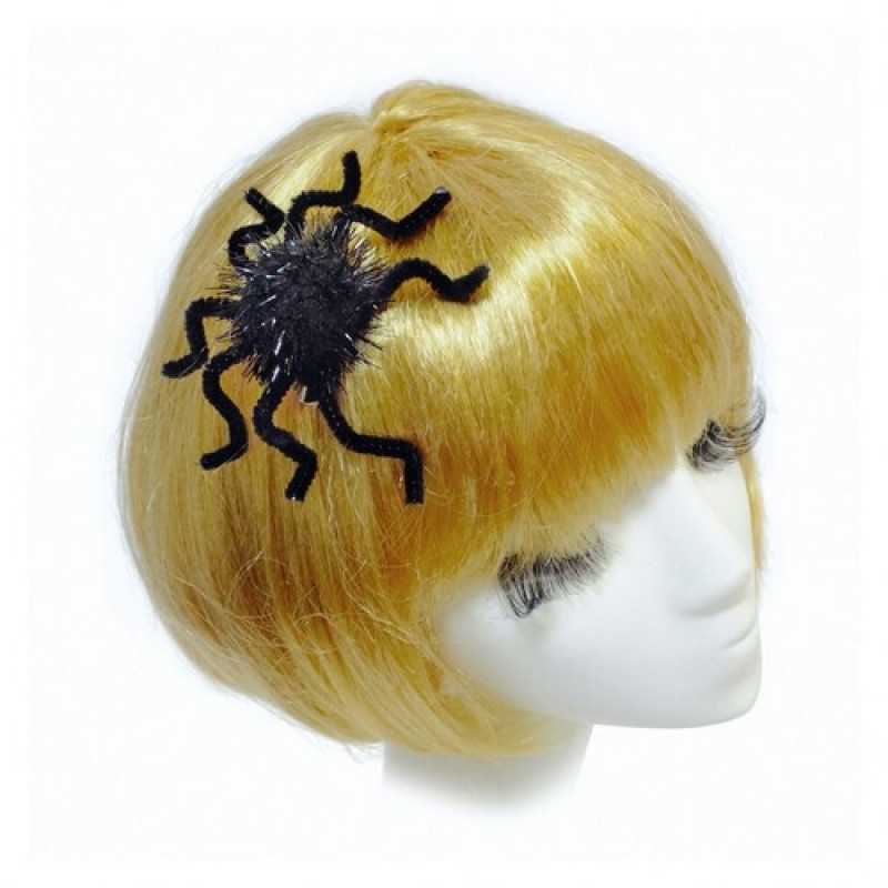 Чорний м'який мохнатий павук на металевому кріпленні з шпилькою та заколкою, що дозволяє використовувати його як шпильку у волосся, так і брошку на одяг. Лапки можна вигинати, надаючи їм різну форму.